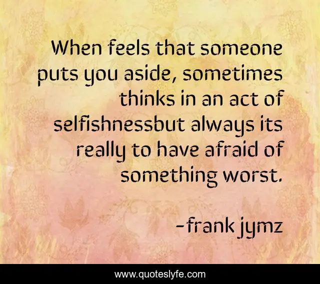 This page presents the quote "When feels that someone puts you aside, sometimes thinks in an act of selfishnessbut always its really to have afraid of something worst.". Author of this quote is frank jymz. This quote is about selfishness, enthusiasm, differences, inspirational, self-help,.