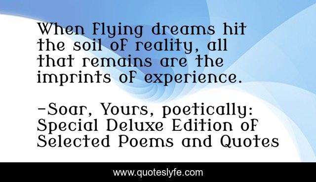 This page presents the quote "When flying dreams hit the soil of reality, all that remains are the imprints of experience.". Author of this quote is Soar, Yours, poetically: Special Deluxe Edition of Selected Poems and Quotes. This quote is about love, poetry, experience, reality, dreams, affection,.