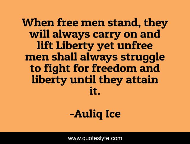 This page presents the quote "When free men stand, they will always carry on and lift Liberty yet unfree men shall always struggle to fight for freedom and liberty until they attain it.". Author of this quote is Auliq Ice. This quote is about war-on-terror, oppression, war-on-drugs, war,.