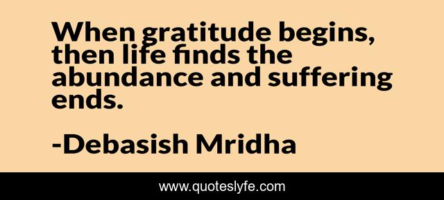 This page presents the quote "When gratitude begins, then life finds the abundance and suffering ends.". Author of this quote is Debasish Mridha. This quote is about life, love, knowledge, inspirational, intelligence, philosophy, wisdom, quotes, affection,.