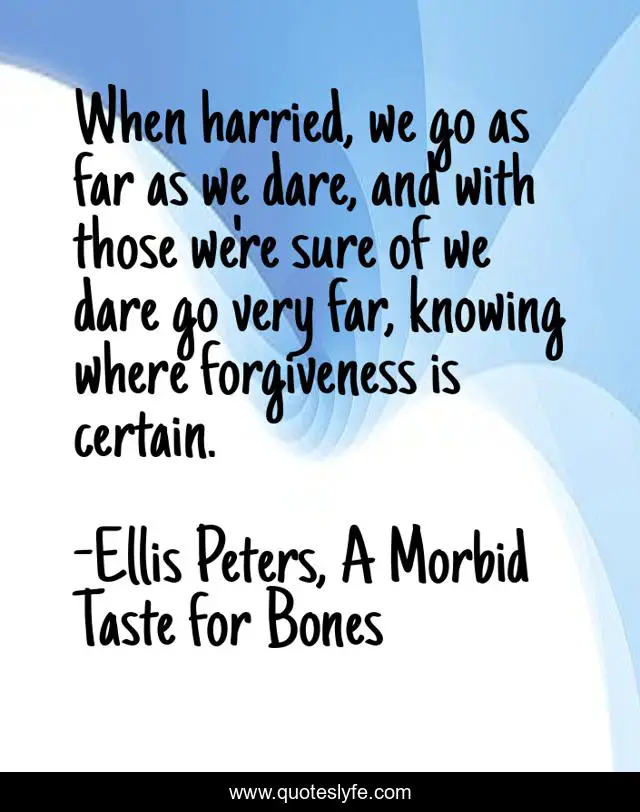 This page presents the quote "When harried, we go as far as we dare, and with those we're sure of we dare go very far, knowing where forgiveness is certain.". Author of this quote is Ellis Peters, A Morbid Taste for Bones. This quote is about forgiveness, daring,.