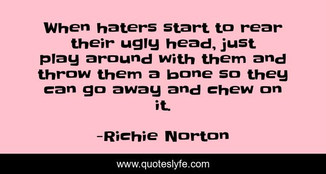 This page presents the quote "When haters start to rear their ugly head, just play around with them and throw them a bone so they can go away and chew on it.". Author of this quote is Richie Norton. This quote is about confidence, self-mastery, mindful, marketing, work, success, self-help, entrepreneur, innovation,.