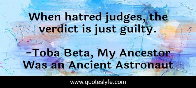 This page presents the quote "When hatred judges, the verdict is just guilty.". Author of this quote is Toba Beta, My Ancestor Was an Ancient Astronaut. This quote is about judge, guilty, hatred, verdict, just,.