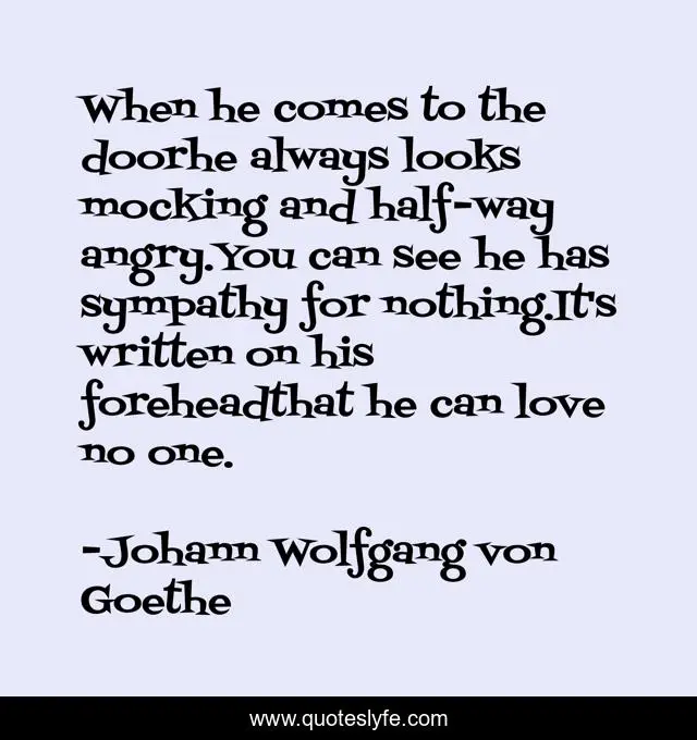 This page presents the quote "When he comes to the doorhe always looks mocking and half-way angry.You can see he has sympathy for nothing.It's written on his foreheadthat he can love no one.". Author of this quote is Johann Wolfgang von Goethe. This quote is about faustian-legend, devil, faust, faustus,.