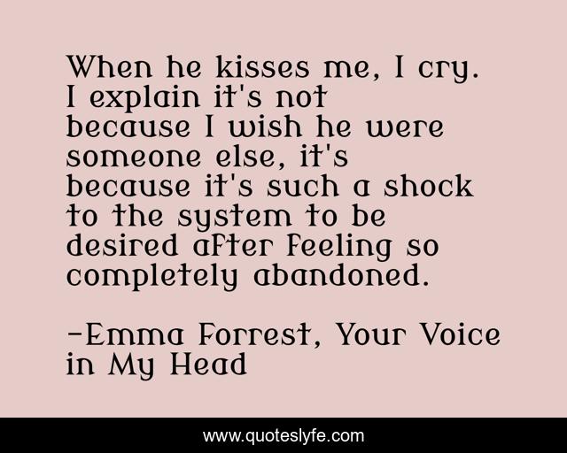 This page presents the quote "When he kisses me, I cry. I explain it's not because I wish he were someone else, it's because it's such a shock to the system to be desired after feeling so completely abandoned.". Author of this quote is Emma Forrest, Your Voice in My Head. This quote is about love, depression, affection,.