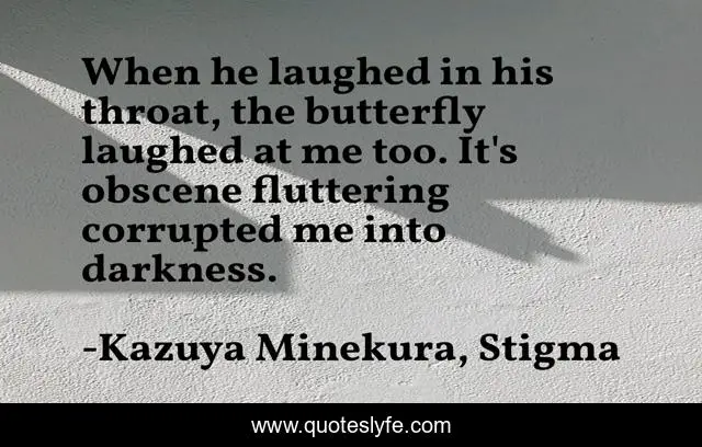 This page presents the quote "When he laughed in his throat, the butterfly laughed at me too. It's obscene fluttering corrupted me into darkness.". Author of this quote is Kazuya Minekura, Stigma. This quote is about butterfly, corrupt, darkness,.