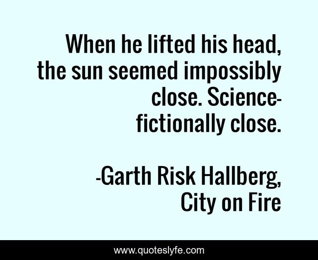 This page presents the quote "When he lifted his head, the sun seemed impossibly close. Science-fictionally close.". Author of this quote is Garth Risk Hallberg, City on Fire. This quote is about sun, city-on-fire, description, science-fiction, garth-risk-hallberg,.