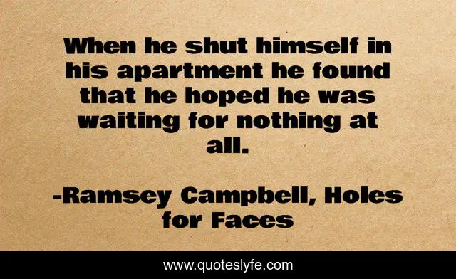 This page presents the quote "When he shut himself in his apartment he found that he hoped he was waiting for nothing at all.". Author of this quote is Ramsey Campbell, Holes for Faces. This quote is about horror-authors, horror, horror-fiction,.
