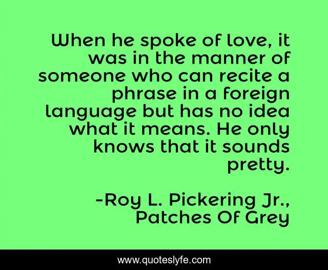 This page presents the quote "When he spoke of love, it was in the manner of someone who can recite a phrase in a foreign language but has no idea what it means. He only knows that it sounds pretty.". Author of this quote is Roy L. Pickering Jr., Patches Of Grey. This quote is about novel, african-american, contemporary, fiction, patches-of-grey, roy-pickering,.
