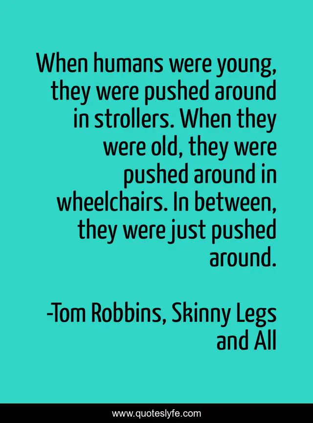 This page presents the quote "When humans were young, they were pushed around in strollers. When they were old, they were pushed around in wheelchairs. In between, they were just pushed around.". Author of this quote is Tom Robbins, Skinny Legs and All. This quote is about age, humans, life,.