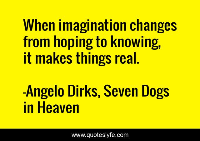 This page presents the quote "When imagination changes from hoping to knowing, it makes things real.". Author of this quote is Angelo Dirks, Seven Dogs in Heaven. This quote is about imagination, hope, reality,.