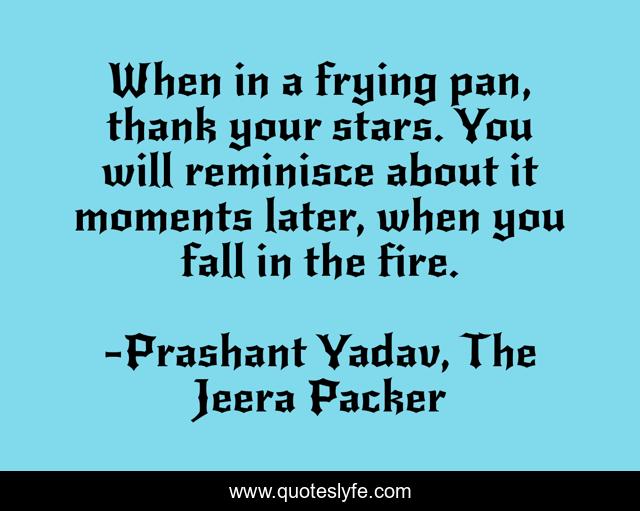 This page presents the quote "When in a frying pan, thank your stars. You will reminisce about it moments later, when you fall in the fire.". Author of this quote is Prashant Yadav, The Jeera Packer. This quote is about witty, humourous, life, optimism, life-lessons,.