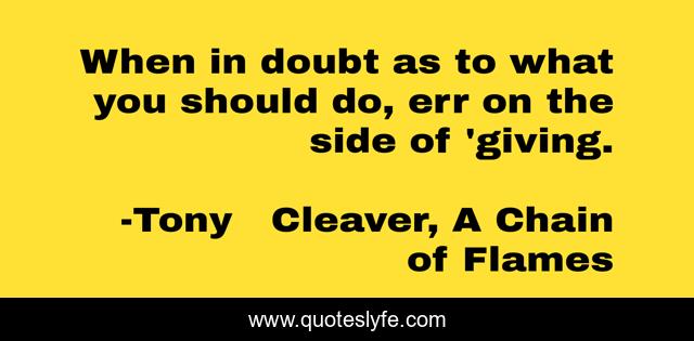 This page presents the quote "When in doubt as to what you should do, err on the side of 'giving.". Author of this quote is Tony Cleaver, A Chain of Flames. This quote is about giving, selflessness, service, charity,.