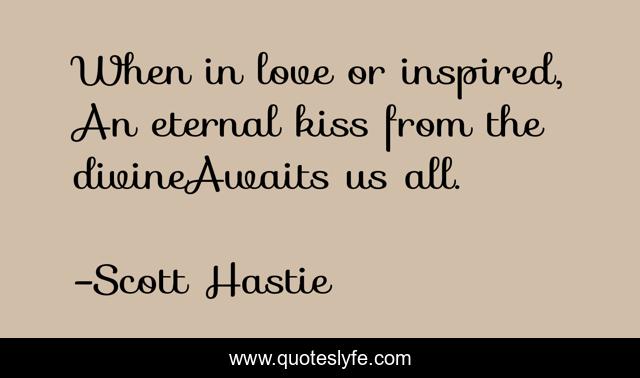 This page presents the quote "When in love or inspired, An eternal kiss from the divineAwaits us all.". Author of this quote is Scott Hastie. This quote is about life, love, wisdom-inspirational, await, eternal, spiritual, us, wisdom, kiss,.