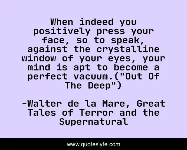 This page presents the quote "When indeed you positively press your face, so to speak, against the crystalline window of your eyes, your mind is apt to become a perfect vacuum.("Out Of The Deep")". Author of this quote is Walter de la Mare, Great Tales of Terror and the Supernatural. .