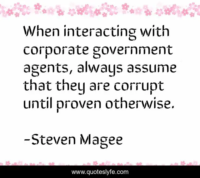 This page presents the quote "When interacting with corporate government agents, always assume that they are corrupt until proven otherwise.". Author of this quote is Steven Magee. This quote is about interacting, government, assume, always, proven, corruption, agents, corrupt, corporate,.
