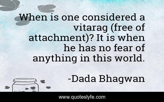 This page presents the quote "When is one considered a vitarag (free of attachment)? It is when he has no fear of anything in this world.". Author of this quote is Dada Bhagwan. This quote is about spiritual, self-realised, self, vitarag, self-realized, soul, knowledge-of-the-self, knowledge-of-self, self-realization,.