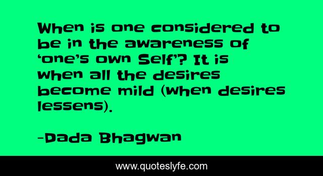 This page presents the quote "When is one considered to be in the awareness of ‘one’s own Self’? It is when all the desires become mild (when desires lessens).". Author of this quote is Dada Bhagwan. This quote is about desire, spiritual, desires, self, soul, atma, awareness,.