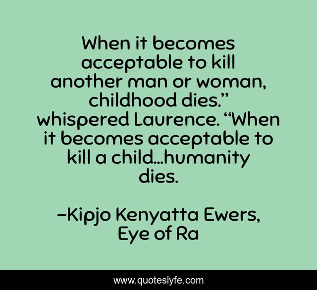 This page presents the quote "When it becomes acceptable to kill another man or woman, childhood dies.” whispered Laurence. “When it becomes acceptable to kill a child…humanity dies.". Author of this quote is Kipjo Kenyatta Ewers, Eye of Ra. This quote is about novel, superhero, action-adventure, science-fiction, alien, contact, inspirational, enthusiasm, ebooks,.