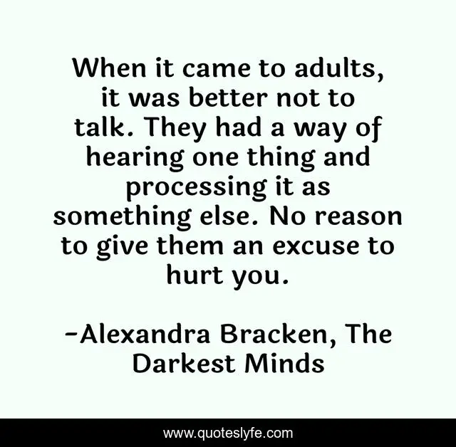 This page presents the quote "When it came to adults, it was better not to talk. They had a way of hearing one thing and processing it as something else. No reason to give them an excuse to hurt you.". Author of this quote is Alexandra Bracken, The Darkest Minds. This quote is about life-lessons, wisdom,.