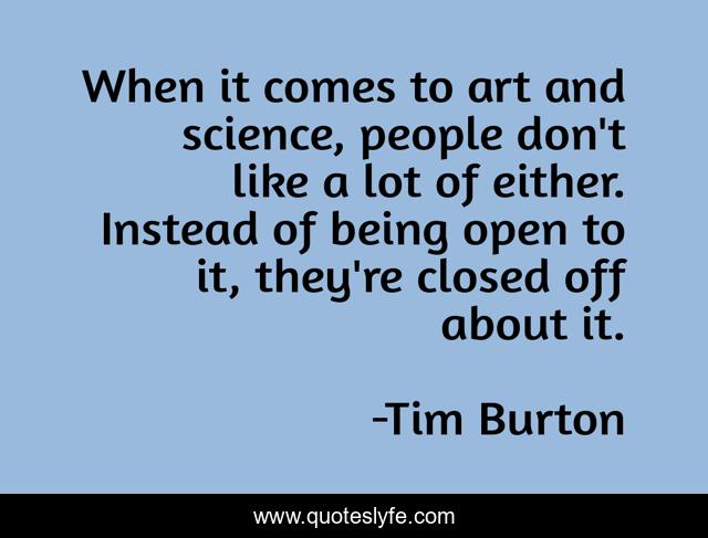 This page presents the quote "When it comes to art and science, people don't like a lot of either. Instead of being open to it, they're closed off about it.". Author of this quote is Tim Burton. This quote is about art, like, people,.