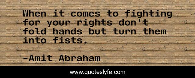 This page presents the quote "When it comes to fighting for your rights don't fold hands but turn them into fists.". Author of this quote is Amit Abraham. This quote is about existence, fights, rights,.