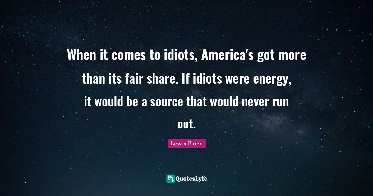 This page presents the quote "When it comes to idiots, America's got more than its fair share. If idiots were energy, it would be a source that would never run out.". Author of this quote is Lewis Black. This quote is about source, share, america, would be, energy, running,.