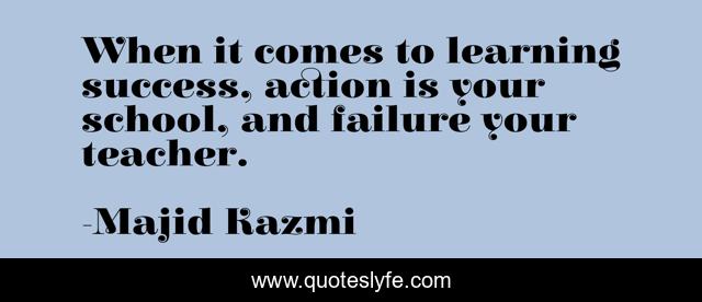 This page presents the quote "When it comes to learning success, action is your school, and failure your teacher.". Author of this quote is Majid Kazmi. This quote is about school, success, failure, learning, inspirational-success-failure, teacher, inspiration,.