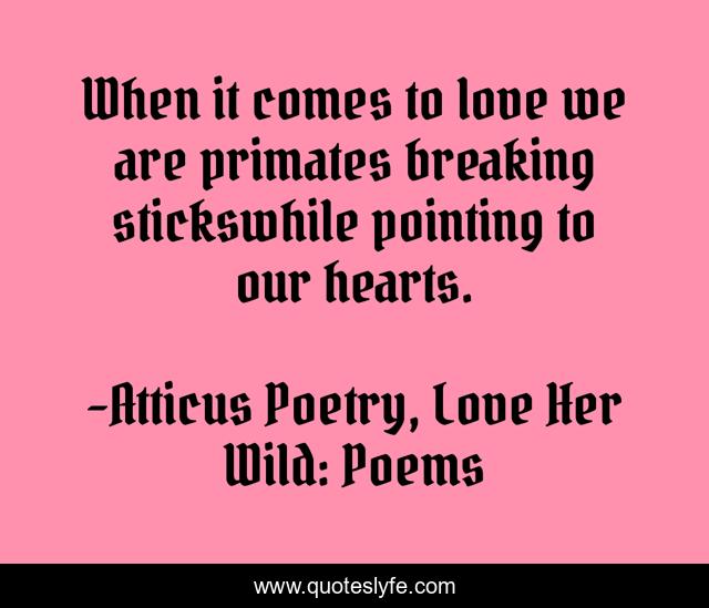 This page presents the quote "When it comes to love we are primates breaking stickswhile pointing to our hearts.". Author of this quote is Atticus Poetry, Love Her Wild: Poems. This quote is about atticus, love, instagram, her, atticuspoetry, poetry, quotes, wild, poems,.