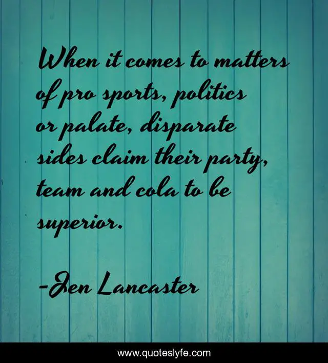 This page presents the quote "When it comes to matters of pro sports, politics or palate, disparate sides claim their party, team and cola to be superior.". Author of this quote is Jen Lancaster. This quote is about politics, team, party,.