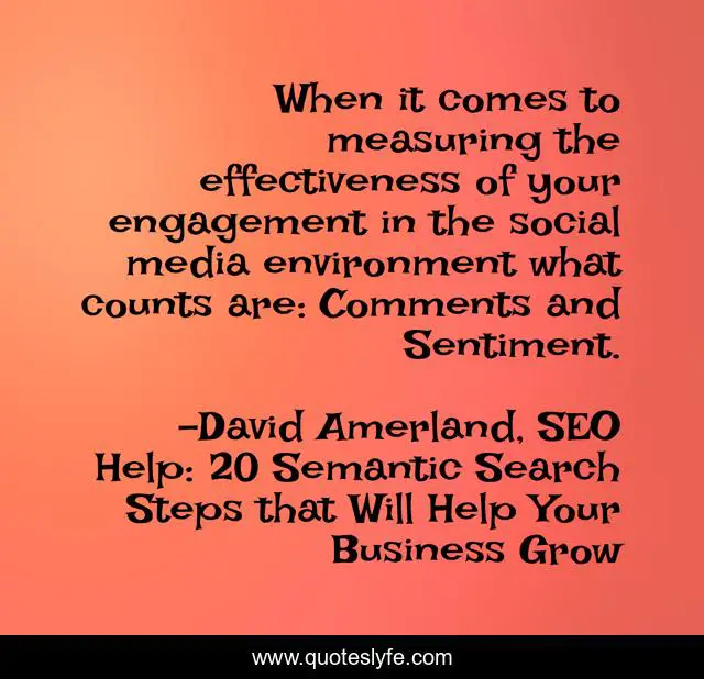 This page presents the quote "When it comes to measuring the effectiveness of your engagement in the social media environment what counts are: Comments and Sentiment.". Author of this quote is David Amerland, SEO Help: 20 Semantic Search Steps that Will Help Your Business Grow. This quote is about seo, branding, semantic-search, marketing,.
