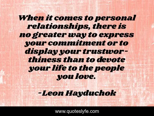 This page presents the quote "When it comes to personal relationships, there is no greater way to express your commitment or to display your trustwor- thiness than to devote your life to the people you love.". Author of this quote is Leon Hayduchok. This quote is about relationships, love, people, commitment, trust, affection,.