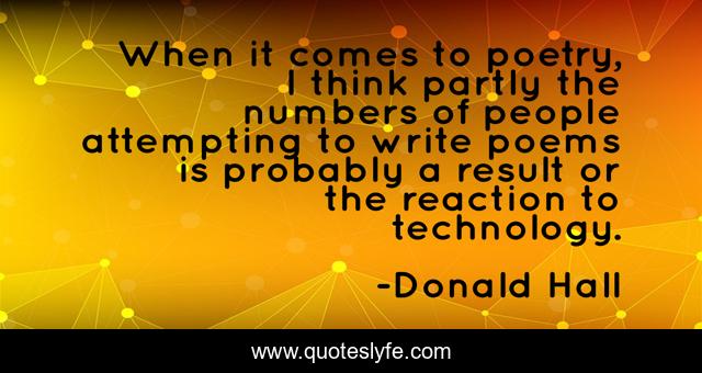 This page presents the quote "When it comes to poetry, I think partly the numbers of people attempting to write poems is probably a result or the reaction to technology.". Author of this quote is Donald Hall. This quote is about technology, think, people,.