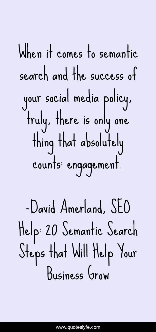 This page presents the quote "When it comes to semantic search and the success of your social media policy, truly, there is only one thing that absolutely counts: engagement.". Author of this quote is David Amerland, SEO Help: 20 Semantic Search Steps that Will Help Your Business Grow. This quote is about seo, branding, semantic-search, marketing,.