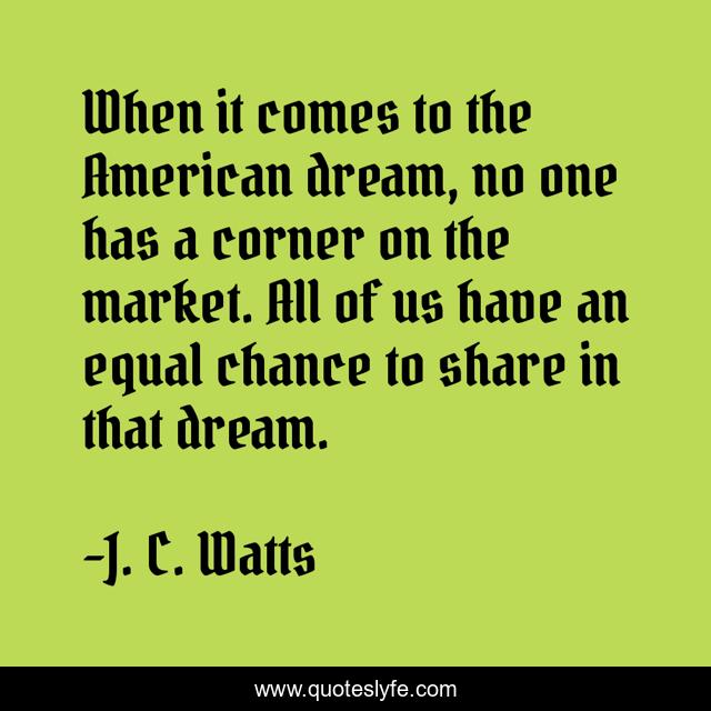 This page presents the quote "When it comes to the American dream, no one has a corner on the market. All of us have an equal chance to share in that dream.". Author of this quote is J. C. Watts. This quote is about american dream, american,.