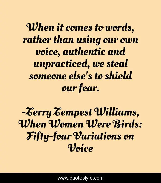This page presents the quote "When it comes to words, rather than using our own voice, authentic and unpracticed, we steal someone else's to shield our fear.". Author of this quote is Terry Tempest Williams, When Women Were Birds: Fifty-four Variations on Voice. This quote is about quote, fear, voice, words, authenticity,.