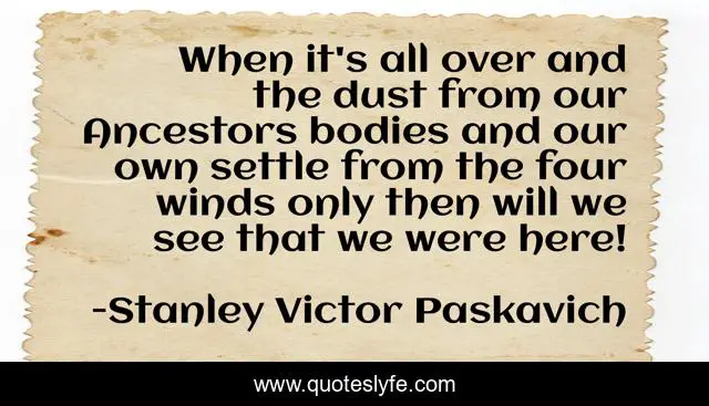 This page presents the quote "When it's all over and the dust from our Ancestors bodies and our own settle from the four winds only then will we see that we were here!". Author of this quote is Stanley Victor Paskavich. This quote is about belief, religion, reincarnation, after-life, spirituality, metaphysics,.