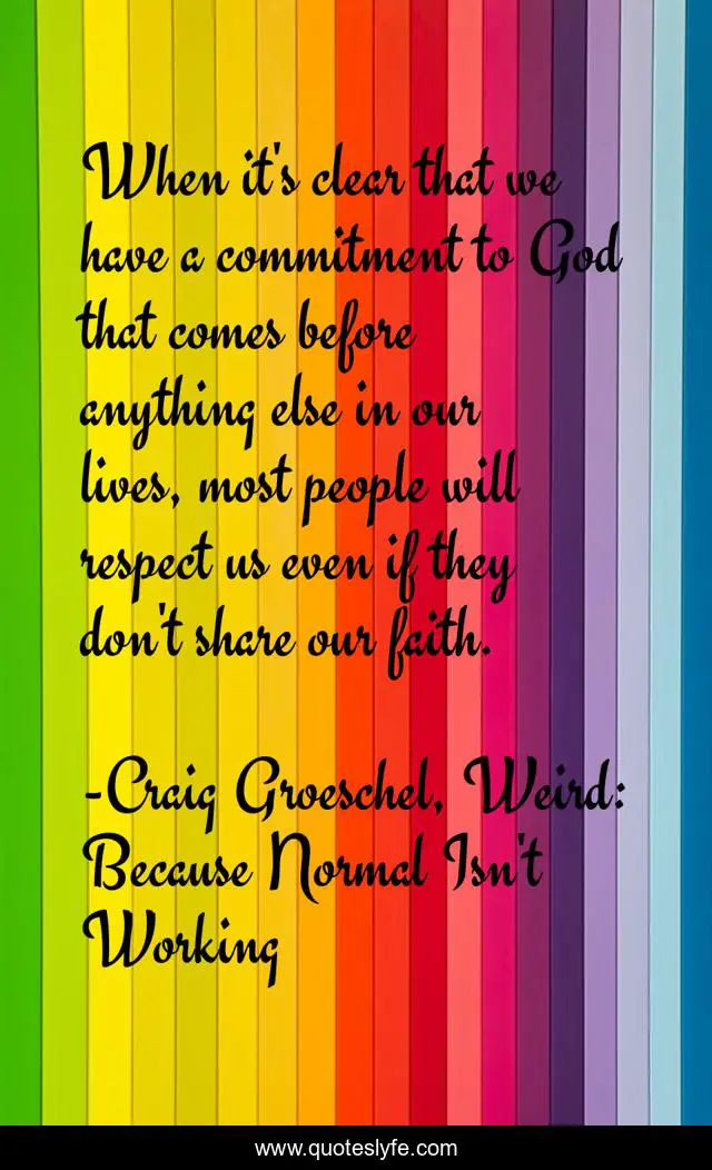 This page presents the quote "When it's clear that we have a commitment to God that comes before anything else in our lives, most people will respect us even if they don't share our faith.". Author of this quote is Craig Groeschel, Weird: Because Normal Isn't Working. This quote is about people, share, commitment, have, in, our, before, even, god,.