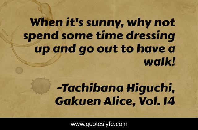 This page presents the quote "When it's sunny, why not spend some time dressing up and go out to have a walk!". Author of this quote is Tachibana Higuchi, Gakuen Alice, Vol. 14. This quote is about mystery, drama, psychology, romance, fantasy, supernatural, adventure, action, comedy,.