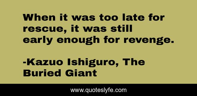 This page presents the quote "When it was too late for rescue, it was still early enough for revenge.". Author of this quote is Kazuo Ishiguro, The Buried Giant. This quote is about rescue, revenge,.