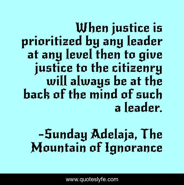This page presents the quote "When justice is prioritized by any leader at any level then to give justice to the citizenry will always be at the back of the mind of such a leader.". Author of this quote is Sunday Adelaja, The Mountain of Ignorance. This quote is about mountain, life, darkness, power, danger, justice, god, people, ignorance,.