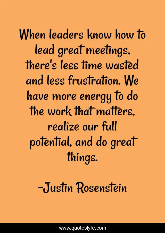 This page presents the quote "When leaders know how to lead great meetings, there's less time wasted and less frustration. We have more energy to do the work that matters, realize our full potential, and do great things.". Author of this quote is Justin Rosenstein. This quote is about great, frustration, time,.