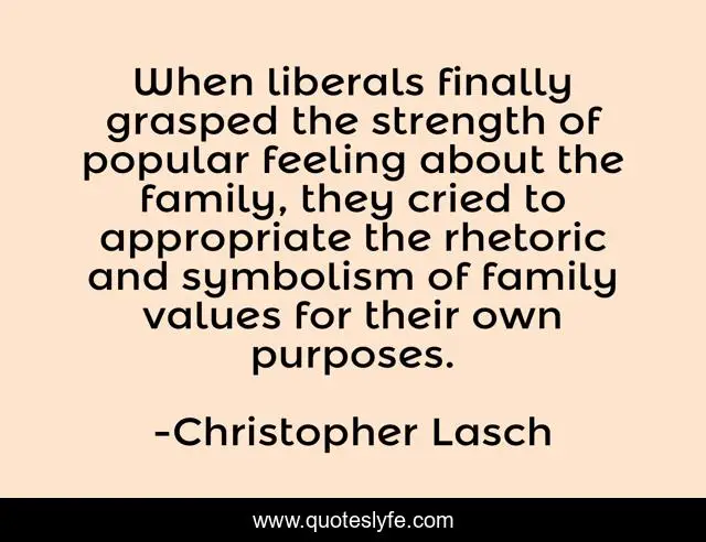 This page presents the quote "When liberals finally grasped the strength of popular feeling about the family, they cried to appropriate the rhetoric and symbolism of family values for their own purposes.". Author of this quote is Christopher Lasch. This quote is about rhetoric, values, family,.