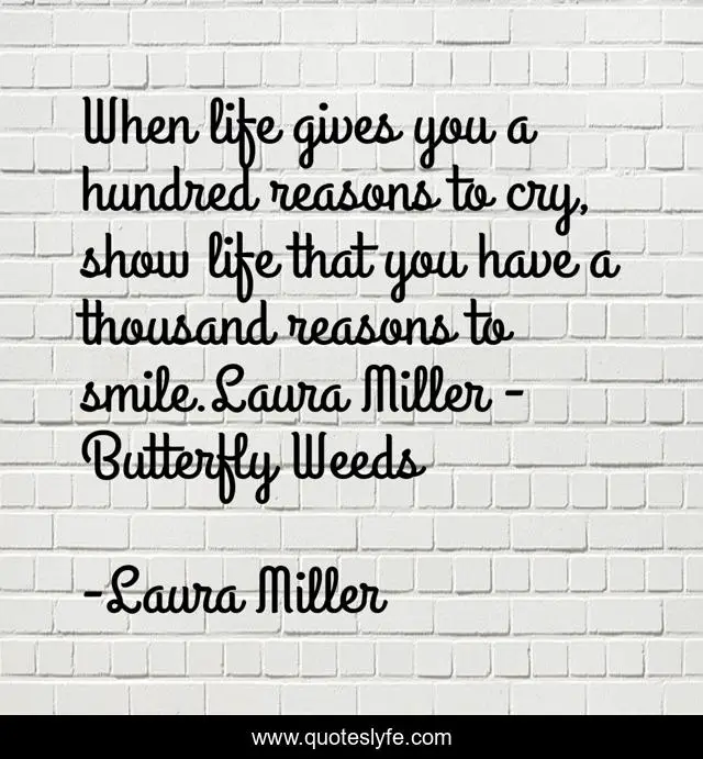 This page presents the quote "When life gives you a hundred reasons to cry, show life that you have a thousand reasons to smile.Laura Miller - Butterfly Weeds". Author of this quote is Laura Miller. This quote is about life, cry, sad, butterfly-weeds, laugh, happy,.