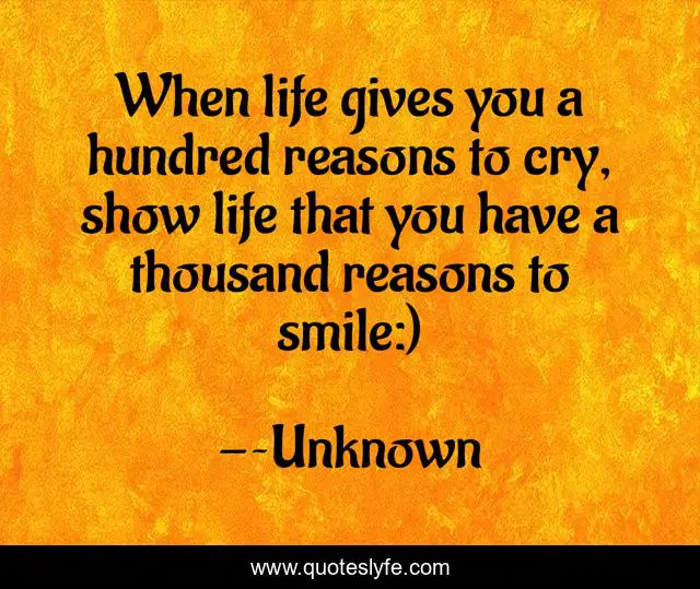 This page presents the quote "When life gives you a hundred reasons to cry, show life that you have a thousand reasons to smile:)". Author of this quote is ~Unknown. This quote is about smile, happiness,.