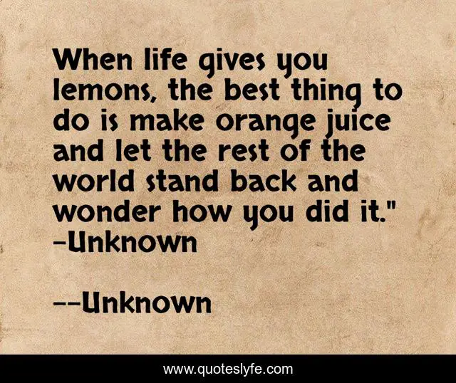 This page presents the quote "When life gives you lemons, the best thing to do is make orange juice and let the rest of the world stand back and wonder how you did it." -Unknown". Author of this quote is -Unknown. .