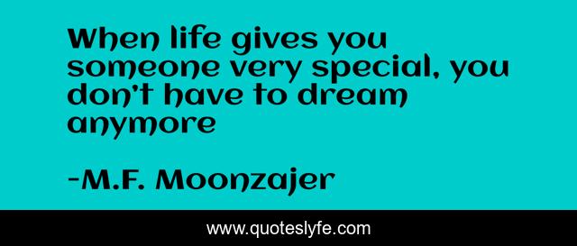 This page presents the quote "When life gives you someone very special, you don’t have to dream anymore". Author of this quote is M.F. Moonzajer. This quote is about someone-special, dream,.