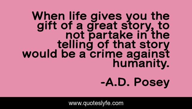 This page presents the quote "When life gives you the gift of a great story, to not partake in the telling of that story would be a crime against humanity.". Author of this quote is A.D. Posey. This quote is about life, storytelling, storytellers, story, writing, write, writers, ad-posey, inspirational,.