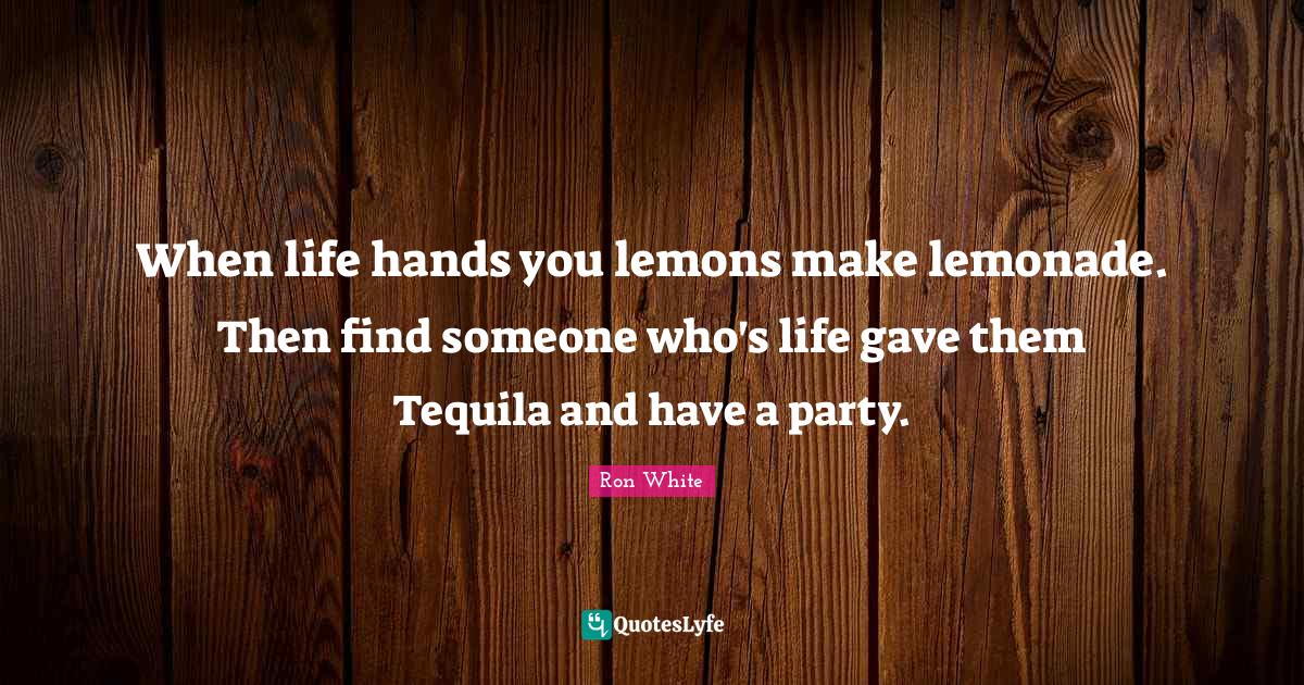 This page presents the quote "When life hands you lemons make lemonade. Then find someone who's life gave them Tequila and have a party.". Author of this quote is Ron White. This quote is about party, hands, make lemonade, tequila, lemons, life,.