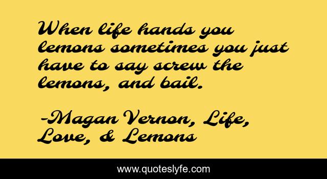 This page presents the quote "When life hands you lemons sometimes you just have to say screw the lemons, and bail.". Author of this quote is Magan Vernon, Life, Love, & Lemons. This quote is about young-adult, humor, life-love-and-lemons,.